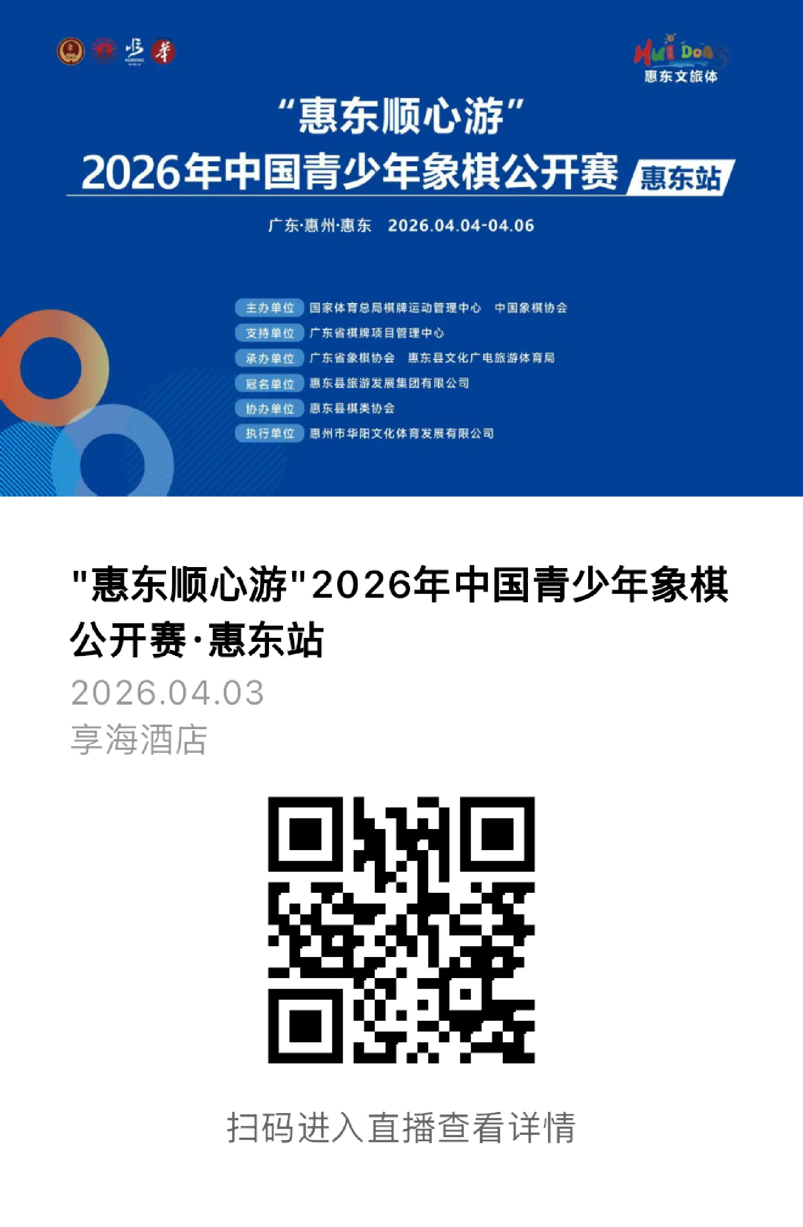 春满惠东,棋韵悠长。2026年中国青少年象棋公开赛(惠东站)将于4月4日至6日在广东省惠州市惠东县双月湾享海国际酒店举行。 本次赛事由国家体育总局棋牌运动管理中心、中国象棋协会主办,广东省棋牌项目管理中心支持,广东省象棋协会、惠东县文化广电旅游体育局承办,惠东县棋类协会协办,惠州市华阳文化体育发展有限公司执行,并首次由惠东县旅游发展集团有限公司倾力打造的全域旅游数字化平台“惠东顺心游”冠名合作。 作为中国象棋协会2026年倾力打造的六场全国青少年公开赛中的第二站,惠东站继丽水站圆满落幕后接棒登场,是中国象棋协会年度赛事体系中承上启下的重要一环。今年,中国象棋协会创新推出专为青少年打造的专项公开赛,连同全国儿童赛、少年锦标赛等传统赛事,遍布大江南北,共同构建起层次丰富、覆盖广泛的青少年赛事体系,旨在为各地青少年棋手提供宝贵的实战锻炼平台与晋升通道,夯实象棋人才根基,培育未来棋坛之星。 本站比赛设U16、U14、U12、U10四个年龄段,分设男子个人、女子个人共八个组别及混合团体项目。赛事吸引了来自全国32个城市、62支代表队的259名优秀青少年棋手报名参赛,其中中国香港象棋总会、澳门象棋总会及澳门多所学校均派出阵容强大的队伍,广东御圣青年队则以超过40人的规模成为本次赛事最大参赛队伍之一。东道主惠东本地棋院与学校踊跃参与,充分展现了惠东深厚的象棋群众基础和青训成果。 本次比赛各组别个人、团体优胜名次者均将获得相应奖励,总奖金及精美奖品价值达5万元。根据《中国象棋协会棋手技术等级管理办法》,各组别将授予相应技术等级称号,成绩优异者最高可获“棋协大师”称号。同时,本次比赛被认定为中国象棋协会B级赛事,各组运动员将依据比赛成绩获得B2级赛事相应个人赛事积分,纳入全国竞赛积分排名体系,为青少年棋手搭建起通向更高舞台的坚实阶梯。 赛事得到“惠东顺心游”全域旅游数字化平台全程冠名支持,平台以“一码在手,让您吃得放心、住得舒心、玩得开心”为服务宗旨,为参赛家庭提供酒店预订、景点一键通览、美食推荐、交通指引等一站式文旅服务。赛事期间,参赛者可通过“惠东顺心游”小程序轻松畅享惠东山海风光,深度体验本地人文风情。 赛事举办地双月湾享海国际酒店坐拥6.5公里黄金海岸线,毗邻海龟湾旅游区、双月湾观景台等知名景点。主办方希望通过“体育+旅游”的融合模式,让参赛者在竞技之余,沉浸式感受惠东的自然之美与人文之韵,真正实现“以赛促游、以游彰文”。 本次赛事还融入了惠东本土深厚的象棋文化底蕴。惠东是中国象棋协会副主席、广东省象棋协会会长、世界冠军吕钦,以及全国冠军、象棋特级大师陈幸琳的家乡。两位棋坛名宿长期以来心系故土,积极推动家乡象棋事业发展。今年春节期间,他们曾联袂在惠东吕钦象棋馆举行象棋车轮战表演赛,为本次公开赛注入浓厚的文化底蕴与传承力量。吕钦与陈幸琳将在赛后共同为获奖选手颁奖,陈幸琳还将带来冠军宣讲,以榜样力量激励青少年逐梦棋坛,为赛事增添荣誉时刻。 惠东站既是青少年棋手切磋棋艺、晋升技术等级的重要平台,也是推动文体旅深度融合、展示惠东山海魅力的精彩窗口。组委会已全面做好赛事组织、安全保障、文旅服务等各项筹备工作,静待全国小棋手以棋会友、竞逐荣光。广象网将全程跟踪报道,所有参赛棋手将建立档案,记录下每一步落子的成长印记。 本次赛事照片直播: 让我们共同期待,来自全国各地的青少年棋手在惠东这片象棋沃土上,以棋会友、以智逐梦,在方寸棋盘间书写属于自己的精彩篇章。 成绩查询:中国青少年公开赛(惠东站)