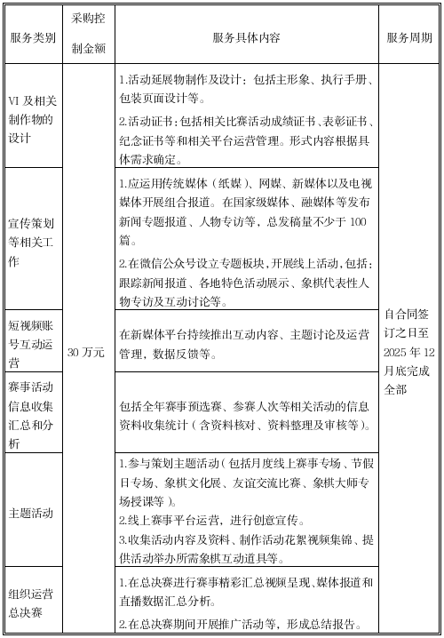 各有关单位: 为贯彻落实全民健身国家战略,充分调动广大象棋爱好者的参与热情,提升2025年全国象棋业余棋王赛的品牌力与影响力,更广泛地调动社会资源,进一步促进象棋项目的宣传推广,棋牌中心现就2025年全国象棋业余棋王赛全年活动运营项目公开征集合作伙伴,有关事宜公告如下。 一、项目名称 2025年第十届全国象棋业余棋王赛全年活动运营 二、项目概述 为赛事策划统一主题及宣传标识物,包括:赛事logo、背景板等;充分利用媒体矩阵,在国家级、省级及主流平台,以图片、文字等形式,对赛事进行全方位、多渠道的宣传报道;制作赛事宣传片,对标准赛事、系列活动、主题活动及相关赛事情况进行广泛宣传;配合完成线上赛事及绩效评估等活动。具体服务内容如下。 三、经费来源 全民健身普及推广(体彩金)经费 四、合作单位条件 (一)具有独立承担民事责任的能力; (二)具有良好的商业信誉和健全的财务会计制度; (三)具有履行合同所必需的人员、设备和专业技术能力,曾与中国象棋协会合作过的单位在同等条件下,享有优先合作权; (四)具有依法缴纳税收和社会保障资金的良好记录; (五)近三年内在经营活动中没有重大违法记录; (六)本次征集合作不接受联合体报价; (七)合作单位不得为“信用中国”网站中列入失信被执行人和重大税收违法案件当事人名单的供应商,不得为中国政府采购网政府采购严重违法失信行为记录名单中的供应商; (八)单位负责人为同一人或者存在控股、管理关系的不同供应商,不得同时参加此项征集。 五、递交合作材料 有合作意向的单位请于5月23日前,向我中心提交合作方案及相关材料,发送电子邮件到:zgxqxh@163.com。材料包括: (一)报名人身份证明及法人授权函(授权函请注明职位); (二)公司营业执照、资质证书、税务登记证(扫描件); (三)公司简介(包含公司规模、团队人员情况)及近三年在全国已完成的优秀类似项目案例; (四)合作方案及计划进度; (五)项目报价单及经费预算表。 六、合作单位考察及确定公布 我中心收到材料后,对资料进行审核、评估,从中择优遴选出合作单位,并上网公示,公示日期为公示发布后之日起7个工作日。 七、联系方式 联系人:董桉琪 联系电话:010-87559138 邮箱:zgxqxh@163.com 体育总局棋牌中心 2025年5月15日 |