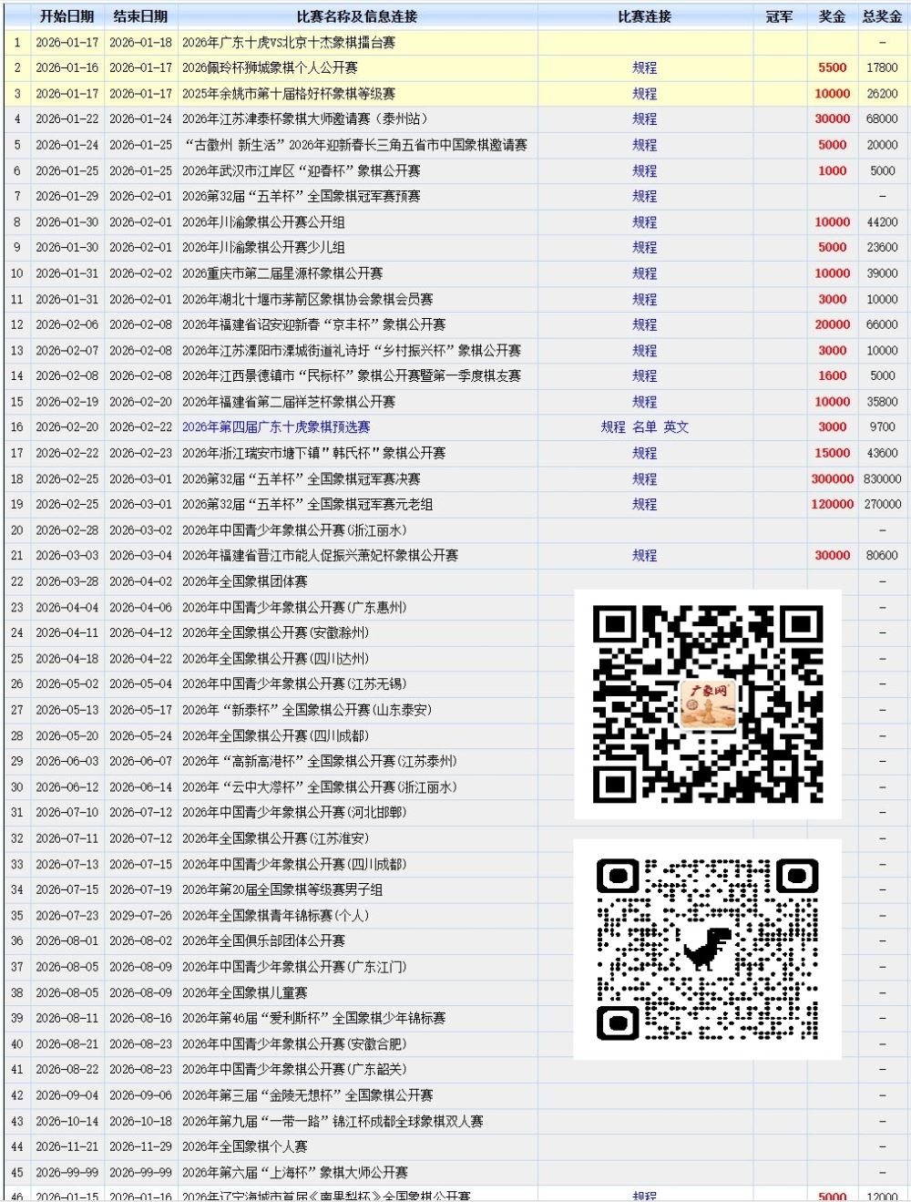 以规划引领未来,用赛事点亮棋坛---为中国象棋协会前瞻性布局点赞 1月16日,新年新气象,中国象棋协会重磅发布《2026年赛事计划表》、《积分赛分级细则》、《地方赛事申报认证工作的通知》,这份横跨全年、覆盖全国、层次分明的新年“赛历”与详尽的工作安排,展现出协会的统筹规划能力与务实高效的工作作风,一幅推动象棋事业高质量发展的清晰蓝图令人眼睛一亮,催人奋进,值得棋界内外广泛赞誉。 赛事规划彰显专业与担当,令人称道。 协会提前公布涵盖A、B、C级及专项青少年赛事、全国象棋公开赛在内的全年计划,其意义深远。它有效解决了过去赛事可能“撞车”、棋手抉择困难、基层筹备仓促等问题,为全国棋手、教练、办赛方提供了明确的时间表和路线图。这种系统性、前瞻性的规划,推动象棋赛事规范化、专业化、可持续发展的关键一步,体现了协会作为行业引领者的责任担当与管理智慧。 重心下沉,战略举措,培育象棋未来之星。 计划中最引人注目的亮点,当属八场专为青少年打造的公开赛,开创历史先河,连同全国儿童赛、少年锦标赛等传统官赛,共同构成了层次丰富的青少年赛事体系。象棋的未来在于青少年,协会将大量优质赛事资源向青少年倾斜,夯实人才根基,战略体现。这八场赛事遍布大江南北,为各地青少年棋手提供了宝贵的实战锻炼和晋级通道,是培育“未来棋坛之星”的摇篮。 层级分明、覆盖广泛的赛事矩阵,激活基层活力。 与赛事计划相配套的《积分赛分级细则》及《地方赛事申报认证工作的通知》,构建了一套从国家级专业顶级(A级)到地方性普及活动(D、E级)的完整竞赛体系。给予使用“中国象棋协会积分赛”标识的资格,为地方赛事注入了一剂“强心针”。它提升了地方赛事的规范性与权威性,通过积分体系将其纳入全国性的评价体系,有效激发了省、市、县乃至社区、乡镇办赛的积极性。 积分赛分级细则的出台更是规范办赛的点睛之笔,规范引导,保障赛事品质。 系列文件对各级赛事的组织、场地、安保、宣传、后勤等提出了明确细致的标准与建议,特别是强调了安全风险评估、保险购买、医疗保障等底线要求。这并非束缚手脚,而是为各类赛事,特别是基层赛事提供了科学专业的“办赛指南”,帮助主办方规避风险、提升品质,确保象棋活动在安全、有序、热烈的氛围中开展。鼓励开放观赛、要求直播转播等宣传要求,则让象棋赛事获得更多曝光机会,延续象棋群体的参与热情。 地方与基层是象棋运动扎根生长的沃土,从广象网列出的近期众多地方赛事已可窥见基层象棋热情之高涨。中国象棋协会开放D级、E 级赛事认证,计划认证45站地方赛事等这一系列举措,是一次立足当前、着眼长远的系统性工程布局,它赋予了基层办赛自主权,也为地方自主品牌赛事提供了成长空间,“专业引领”与“大众参与”互促进,为象棋项目走出低谷、重现热潮奠定了坚实的制度与群众基础。 象棋承载着中华优秀传统文化的精髓,兼具竞技性与益智性。期待各地体育部门、协会和社会机构积极响应,借助协会搭建的优质平台,因地制宜举办各类赛事。我们期待,在这份宏伟蓝图的指引下,2026年的象坛能够百花齐放、赛事纷呈。更呼吁各地政府、体育部门、象棋协会、社会组织及企业、有志之士,积极响应协会号召,充分利用积分赛认证等利好政策,立足本地,办出特色、办出水平、办出影响力。 无论是地方联赛、乡镇村赛,还是企业邀请赛、社区友谊赛、棋协会员赛,每一场赛事的举办,都是在为象棋土壤增添养分,都在为象棋文化传播点亮星光。 让我们携手共进,共迎象棋运动走出低谷,让这一传统瑰宝在全民参与中焕发更持久的光彩! 本文转自广东象棋网新注册的公众号"广象网",相关链接: |